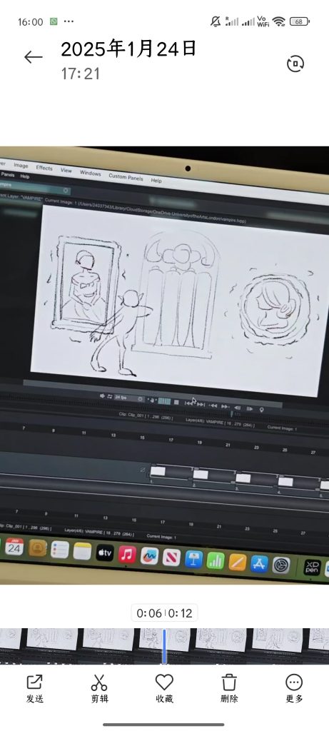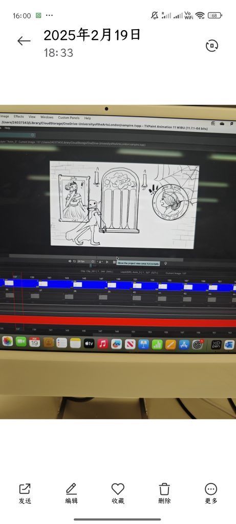 Since only one character could be animated, I focused on how the oil painting woman reacts to the vampire. When the vampire turns its gaze toward the painting, the woman’s face shifts from calm to terror, mimicking a frozen scream. This contrast highlights the vampire’s presence without excessive motion.To add variety, I planned subtle animation for the vampire’s transformation. The character circles the room before morphing into a bat, with his silhouette distorting before vanishing. The finale sees the vampire caught in the sunlight, dissipating into nothingness—a poetic nod to traditional vampire lore.